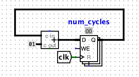 num_checker. Remember to label the register in the gadget tonum_cycles. This gadget, like a counter, allows us to check the current time step by probing the output of the register. This gadget can be located anywhere in thenum_checkercircuit standalone. It’s recommended to build this gadget whenever you debug in projects to make debugging easier.- To edit