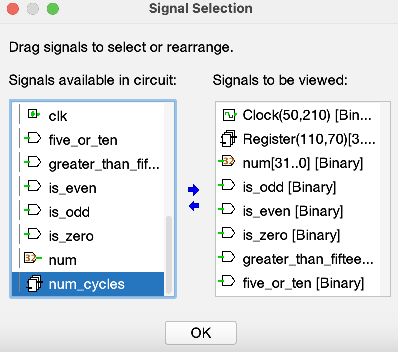 Add or Remove Signalsbutton. Let's remove the signalshaltandCYCLEfrom view by using the arrows in the middle. Let's also add thenum_cyclessignal to view. You can find thenum_cyclessignal by scrolling down the signals available in the circuit and clicking thenum_checkerdropdown.