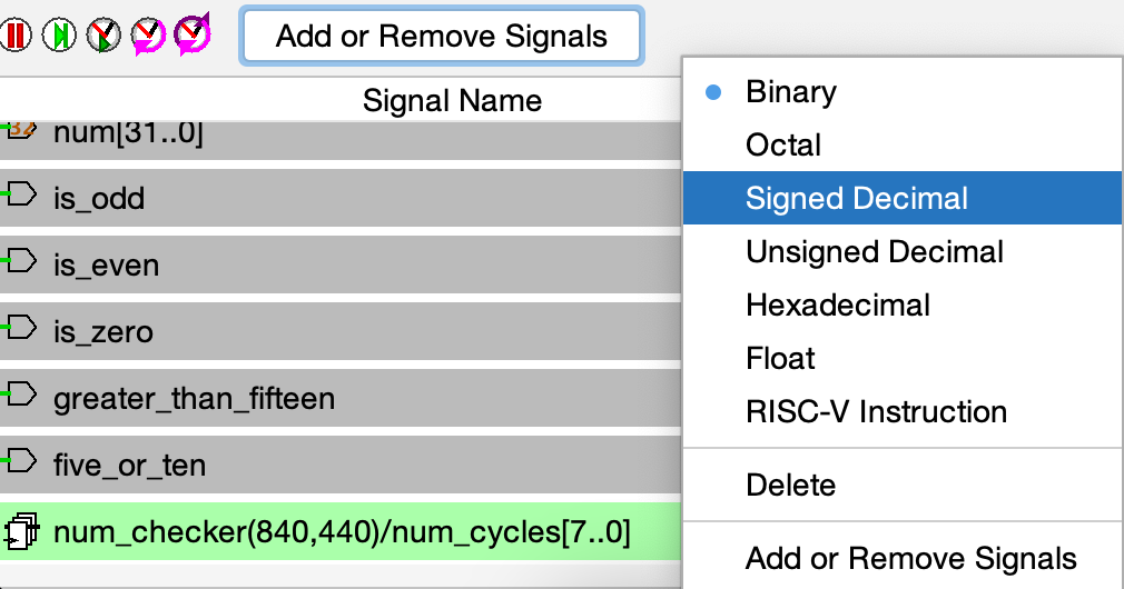 Ok, you should see the addednum_cyclessignal in the waveform viewer. Make sure to expand theSignal Namecolumn so that all text is visible. Then, right click onnum_cyclesto change its type toSigned Decimal. Do the same to thenumsignal.