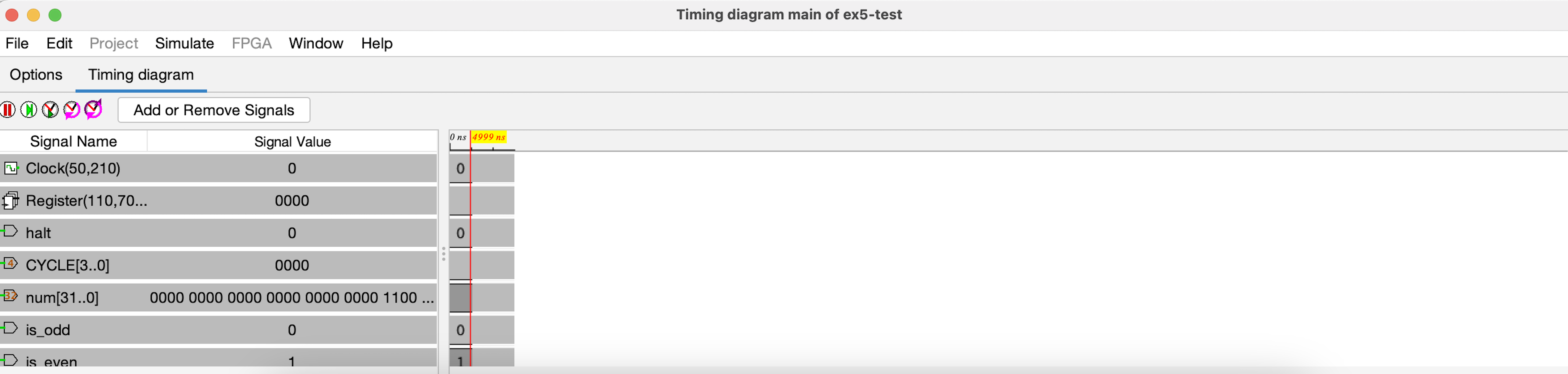 Simulate -> Timing Diagram). After the window pops up, click theTiming Diagramto view the waveforms. If your window is too small, drag it out along the side of your screen so it looks like the window below.